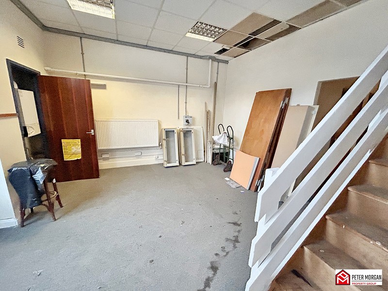 Double entrance doors to front. Built in cupboard housing combi gas central heating boiler. Radiator. Staircase to first floor. Suspended ceiling. Wall mounted electrical meter consumer unit. Mains electrical isolater switch. Variety of electrical power points. Open access to..