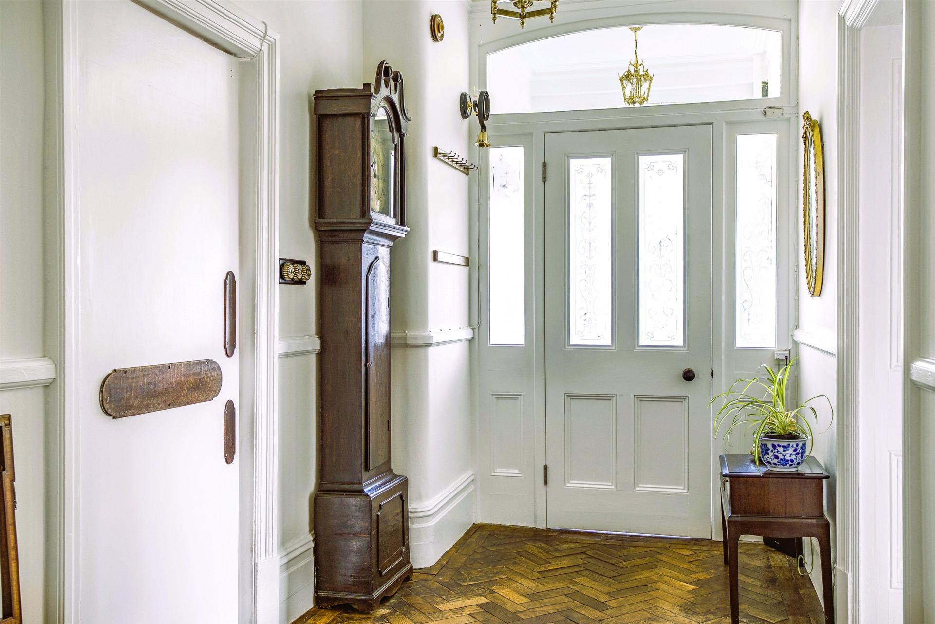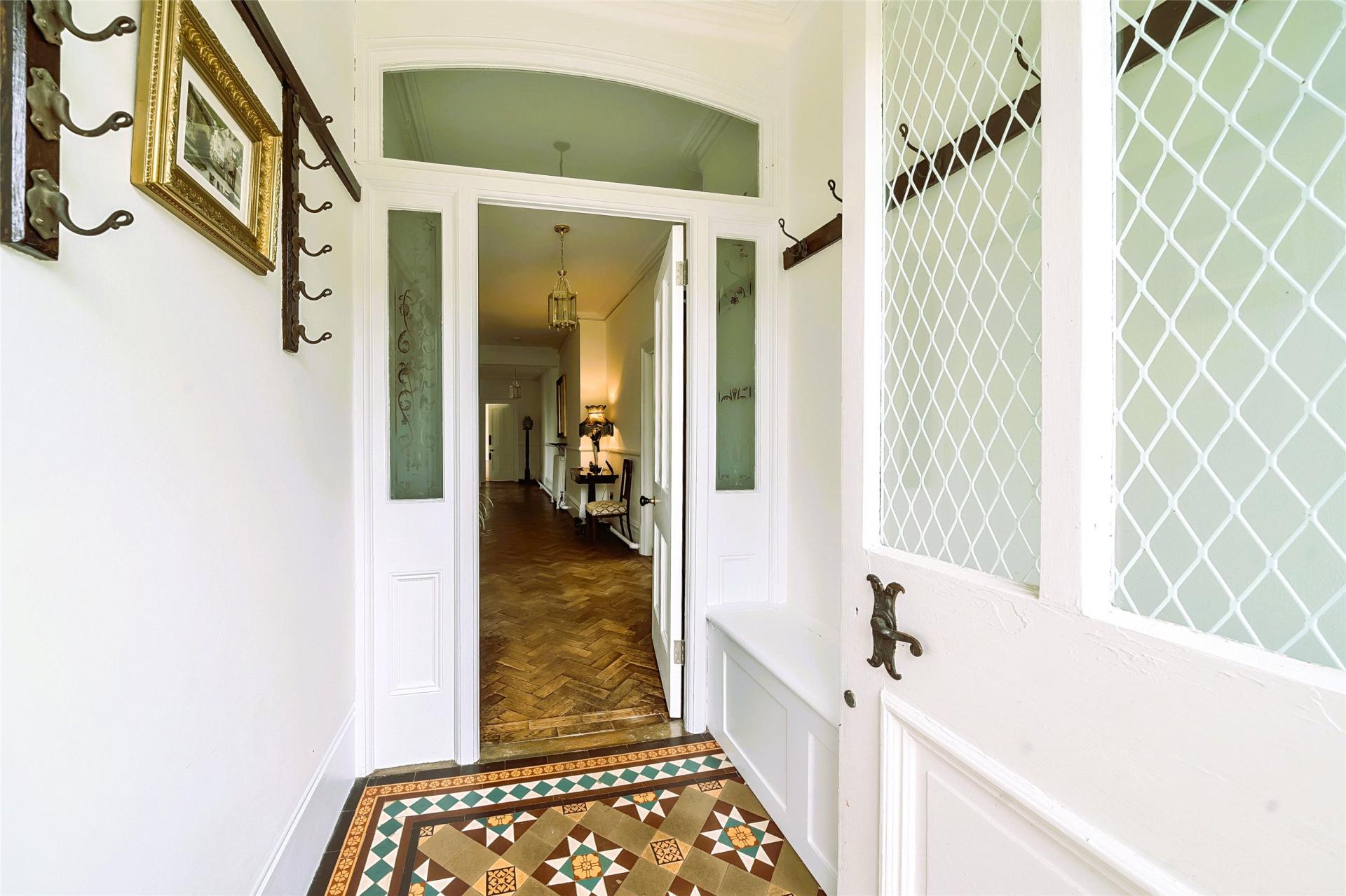As illustrated in the floor plan, the property is entered through an enclosed porch, featuring original Victorian tiled flooring and decorative etched-glass detailing. A door leads into a grand and elegant entrance hall, where beautiful parquet flooring, high ceilings, and intricate cornicing set the tone for the rest of the home.