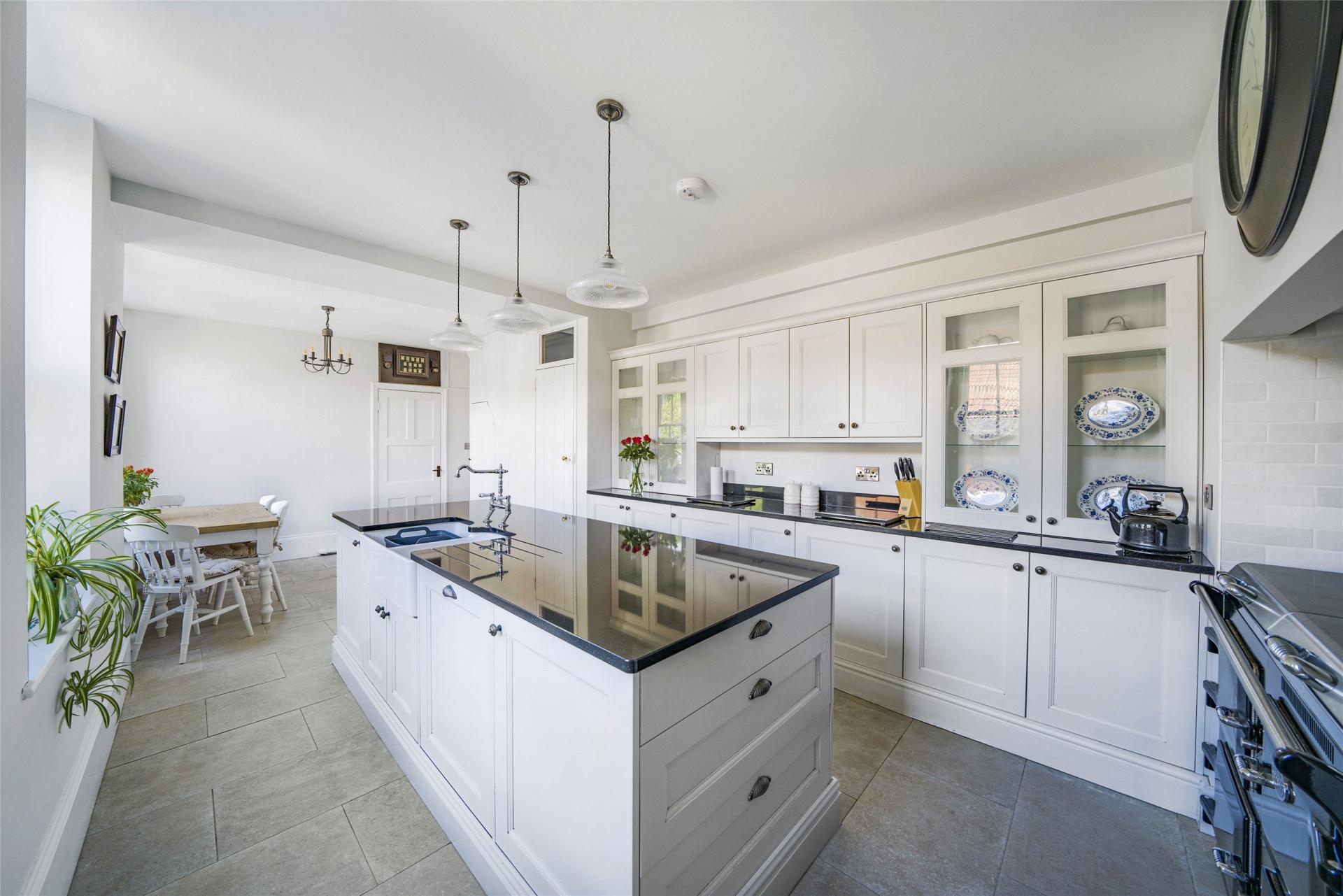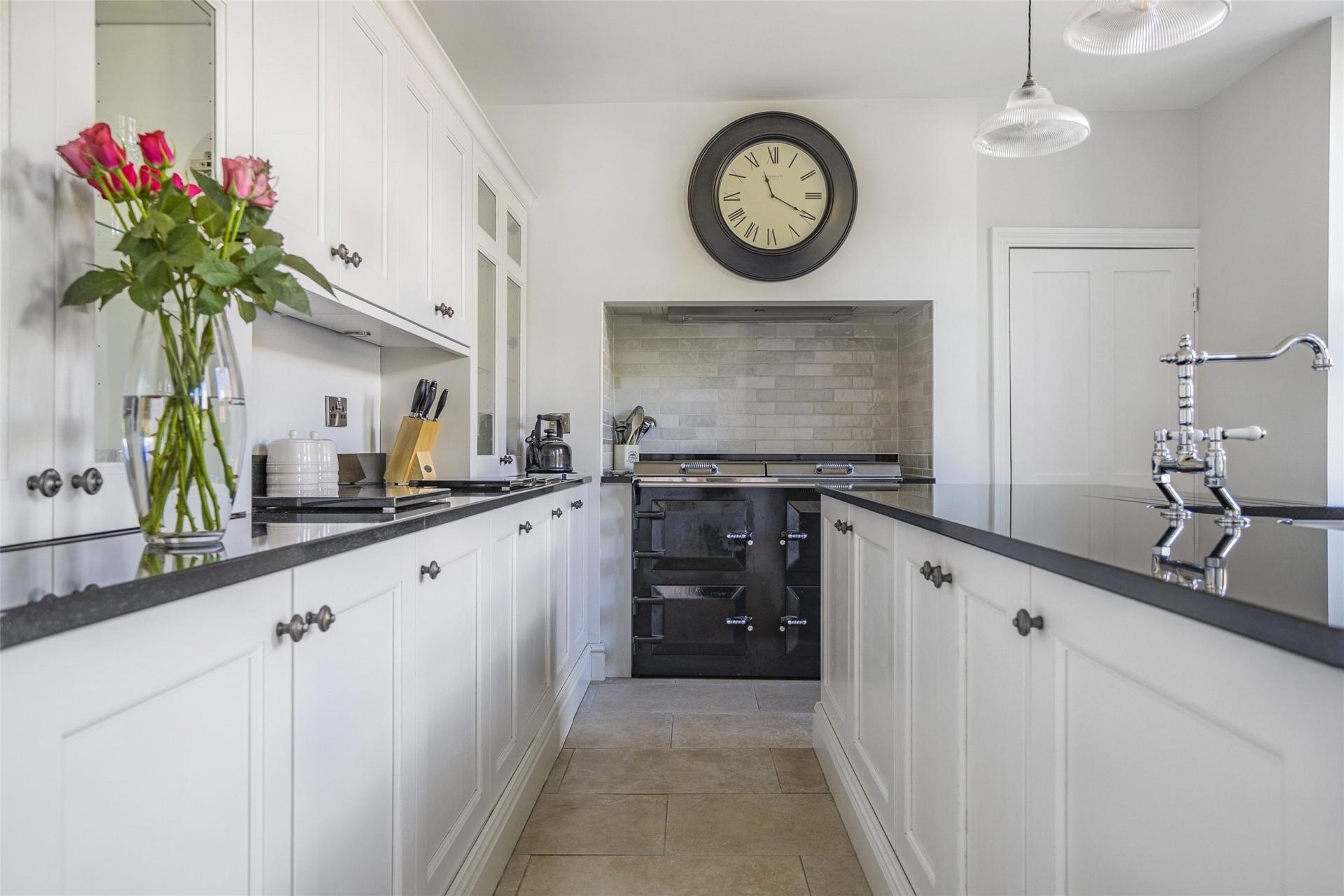 The bespoke kitchen seamlessly blends modern convenience with timeless character, creating a space that is both functional and full of charm. Featuring an electric Everhot oven, an extensive range of handcrafted wall and base units, and a central island, this beautifully designed kitchen is perfect for both everyday living and entertaining. The flagstone flooring adds to the home's rich history, while four large windows overlooking the courtyard enhance the space with natural light, enhancing its warm and inviting atmosphere.