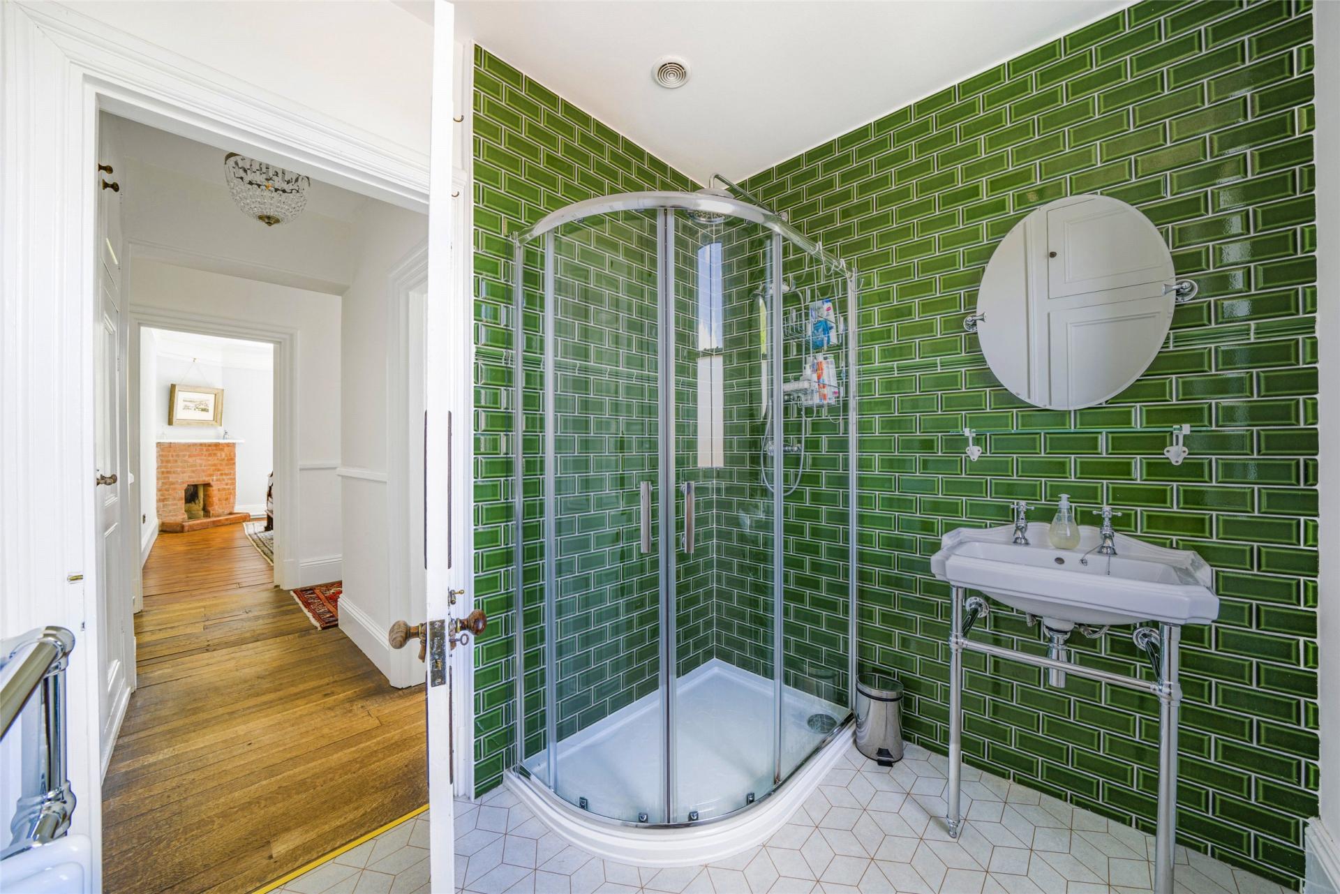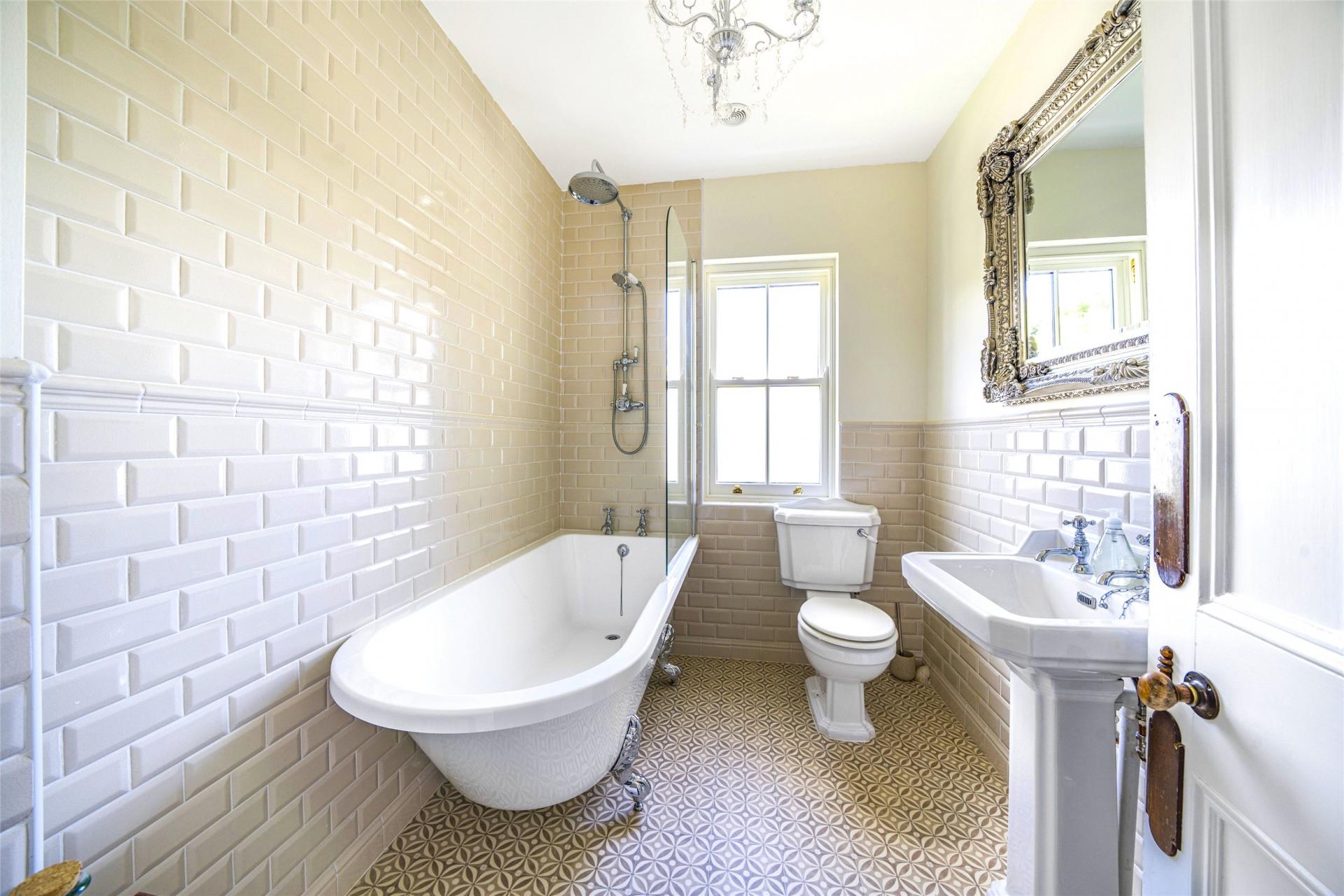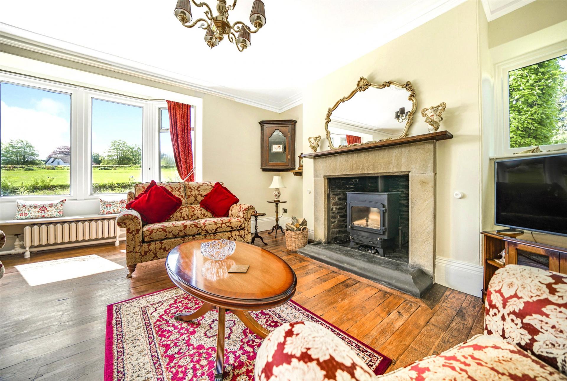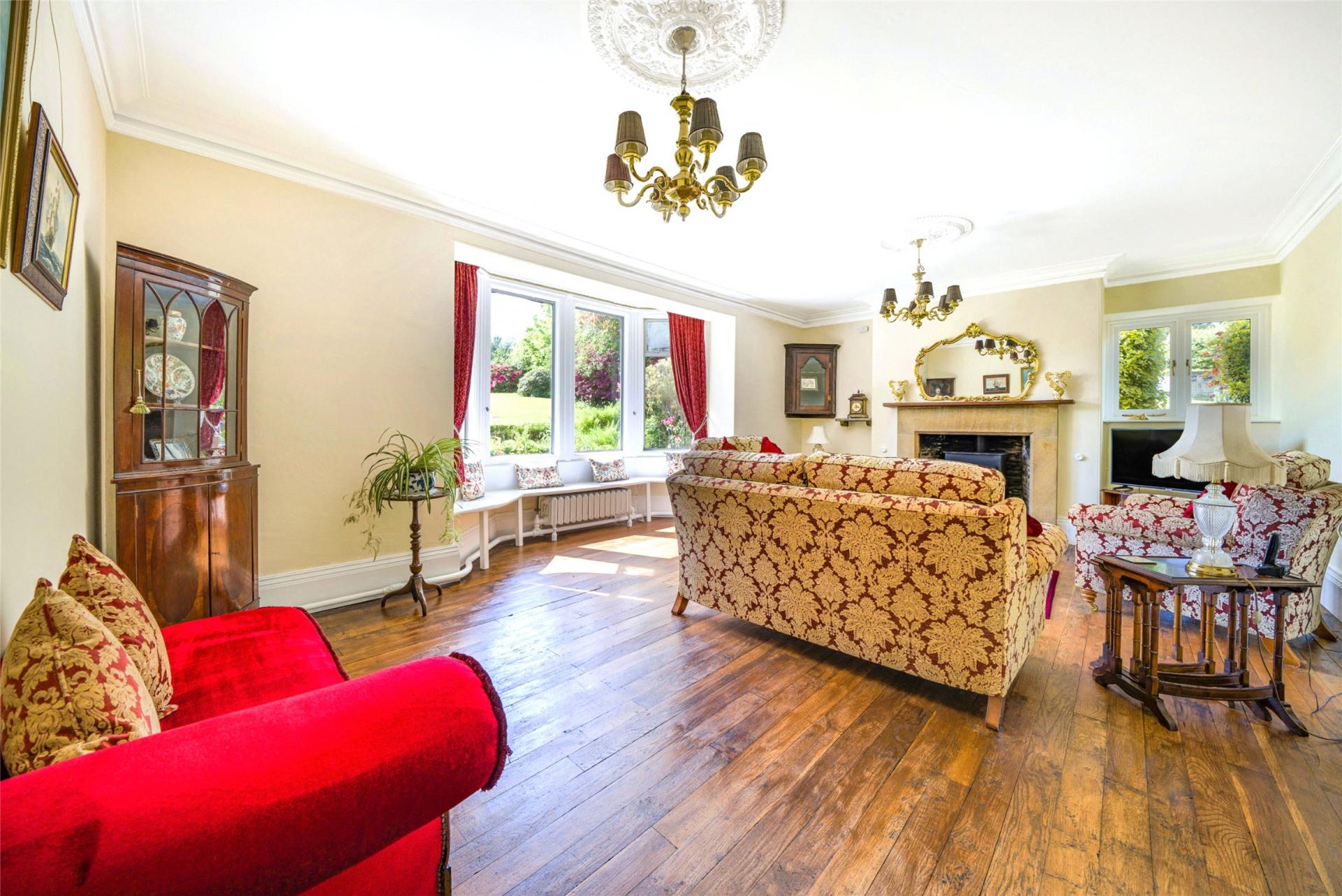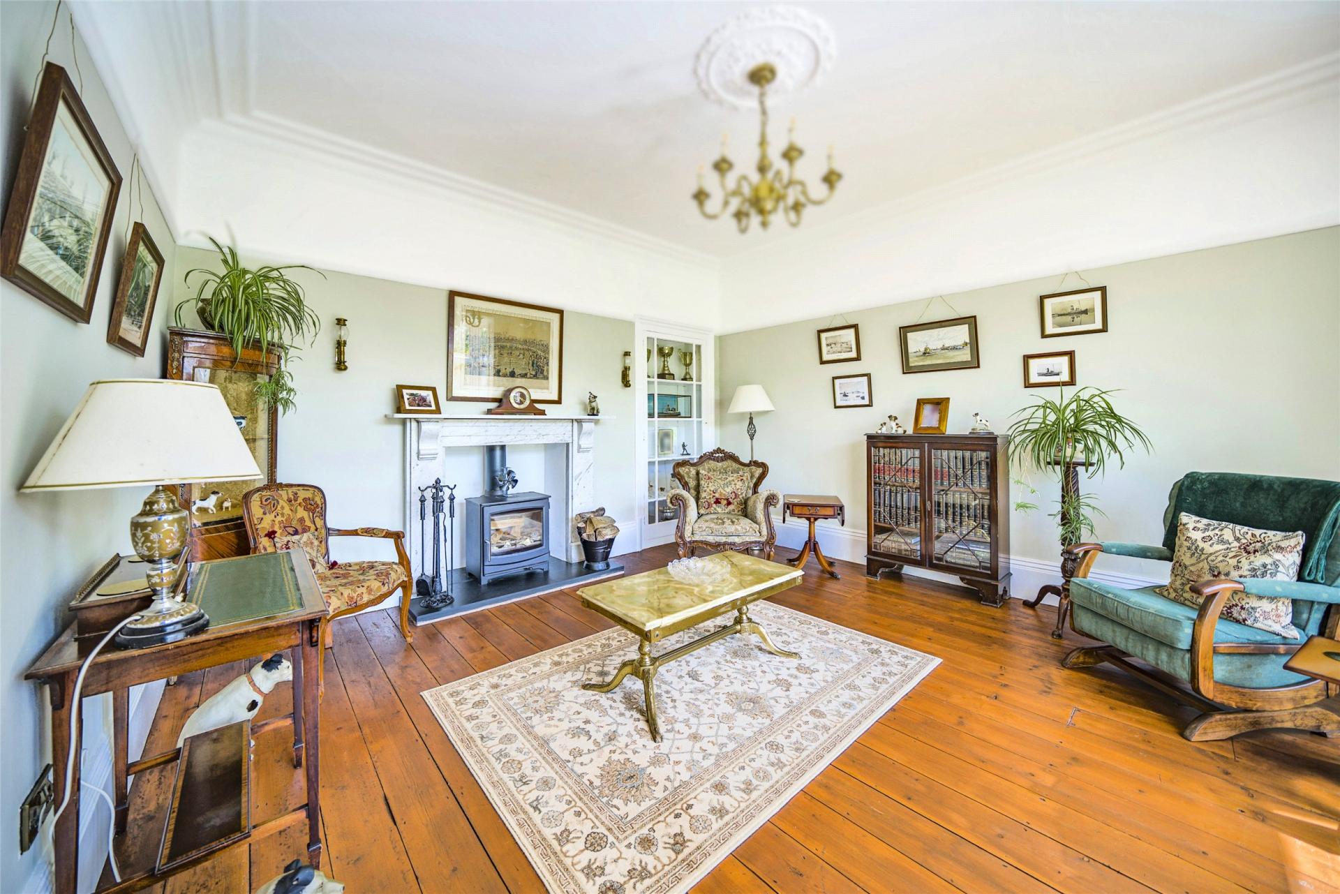 Beyond the entrance hall, the beautifully appointed sitting room provides a serene and sophisticated living space. Flooded with light from the expansive French doors that open onto the gardens, this room seamlessly blends indoor and outdoor living. A striking marble fireplace, complete with an inset wood-burning stove, serves as a stunning focal point, creating a cosy and elegant retreat for all seasons. The original cornicing and deep skirting boards further enhance the period charm, while the neutral colour palette allows the architectural details to shine.
