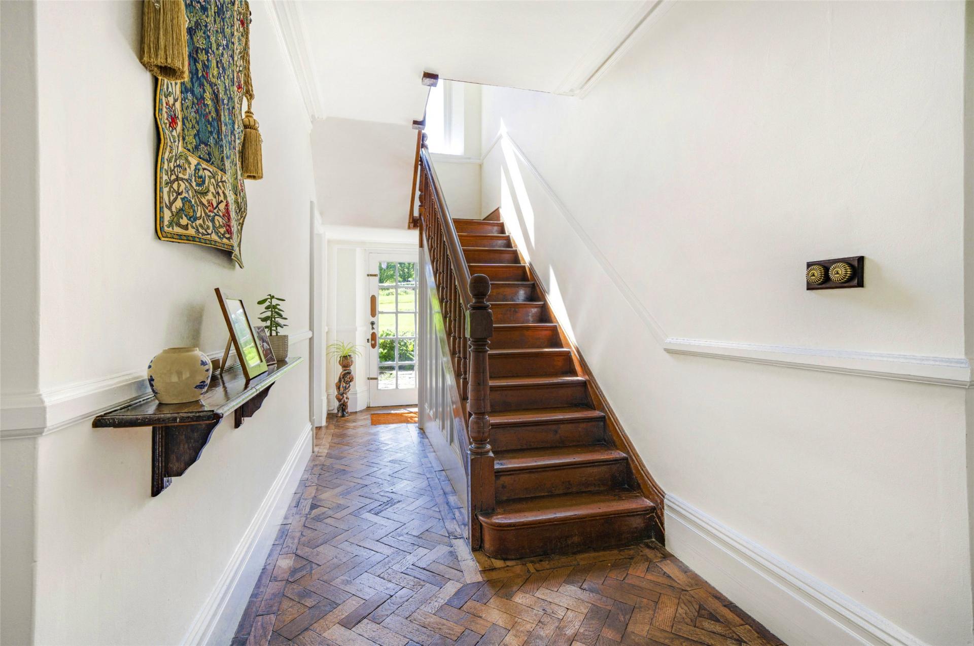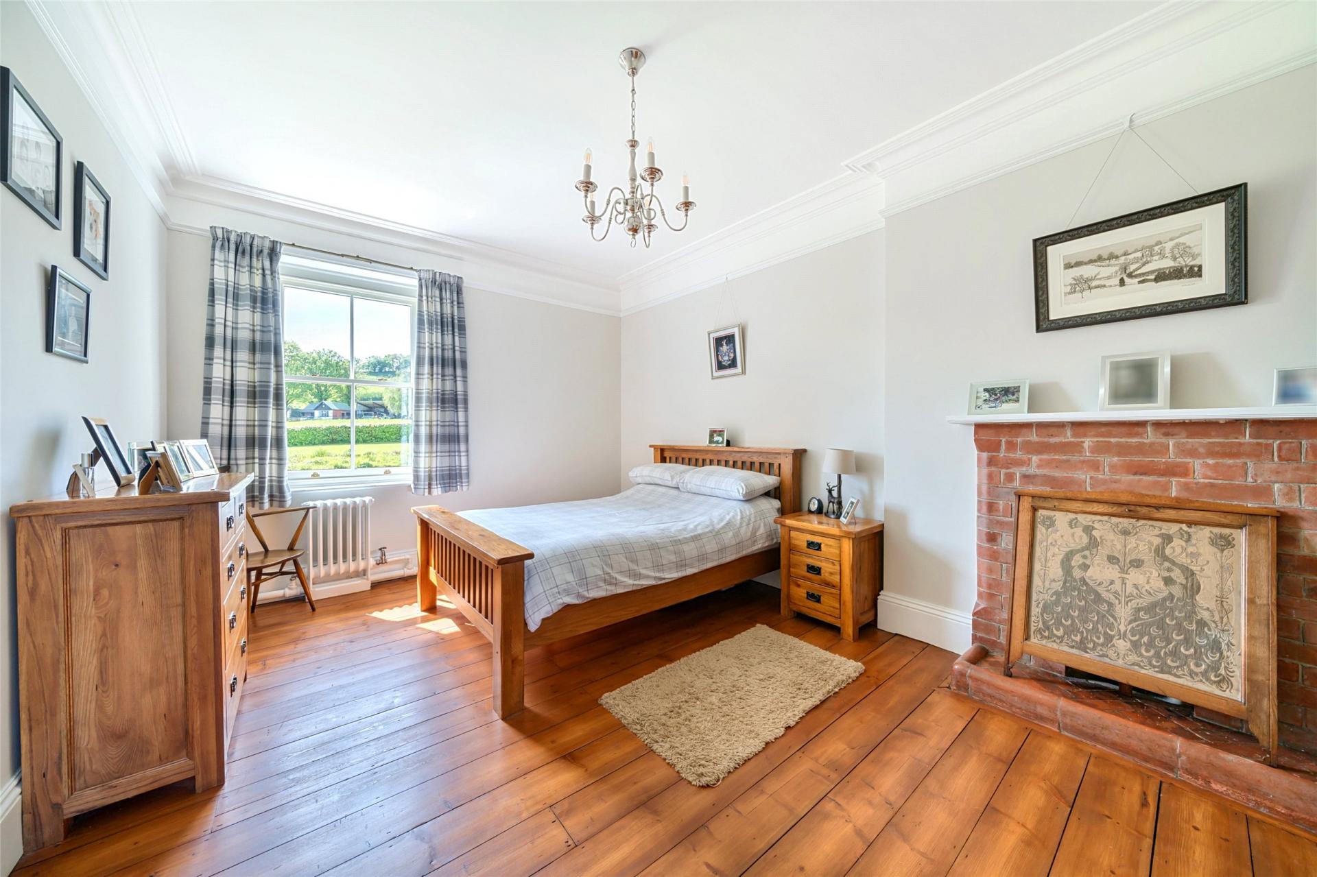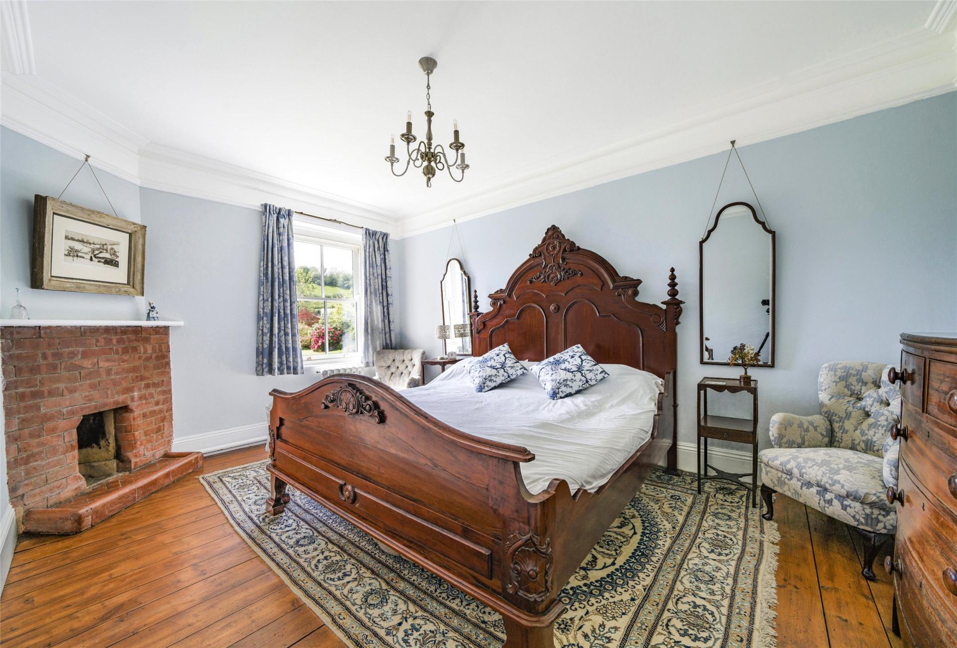 Leading from the entrance hall, a graceful turned staircase ascends to the first floor, where a spacious landing provides access to five beautifully appointed bedrooms. The master bedroom (labelled as Bedroom 1 on the floor plan) is elegantly presented, offering views across the gardens. This room is complemented by an adjacent bathroom and a dedicated dressing room, offering both comfort and convenience.