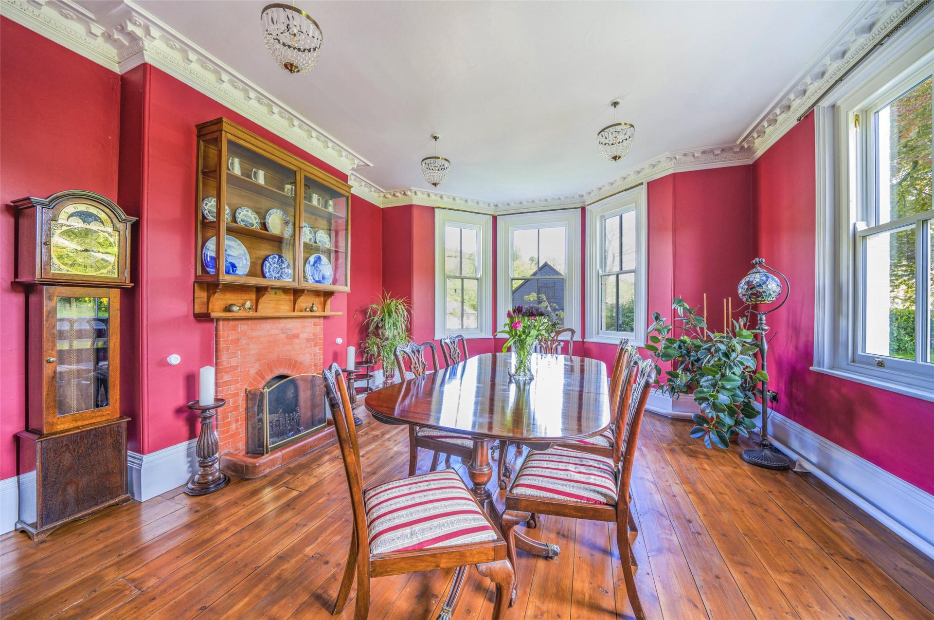 From the entrance hall, a door opens into the substantial double-aspect dining room. This impressive space boasts wooden flooring, a high ceiling with decorative mouldings, and stunning views over the formal gardens. Perfect for entertaining, the room exudes character while offering a warm and inviting atmosphere.