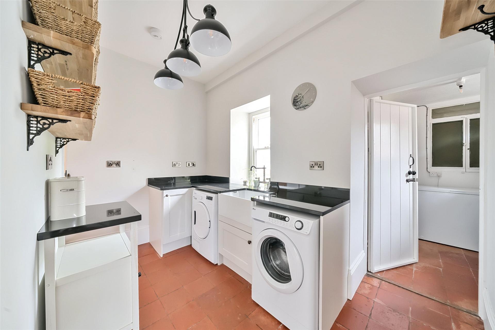 Leading from the kitchen is a highly practical utility and dog room, providing additional storage and workspace. This area offers convenient access to the outdoors, making it ideal for country living. A door also leads to a useful cloakroom, enhancing the functionality of the space. Additionally, the property retains its traditional larder, complete with an original cold slab, preserving a charming piece of its historic character.