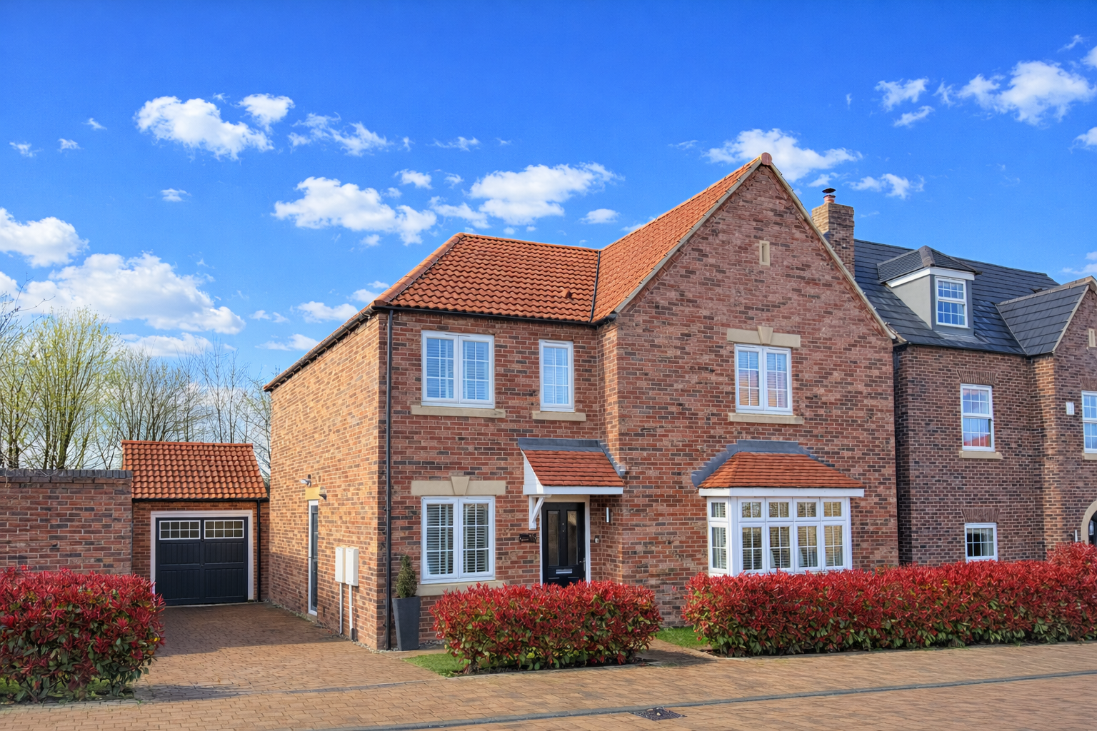 To the outside, a block‑paved driveway provides off‑road parking and access to the detached single garage with light and power. The front garden sits behind a neatly maintained Red Robin hedge, while the landscaped rear garden features an artificial lawn, raised flowerbeds and a stone‑flagged patio ideal for outdoor entertaining. The garden enjoys a particularly pleasant outlook, positioned on the outer edge of the development with a wooded copse and farmland backdrop beyond.
