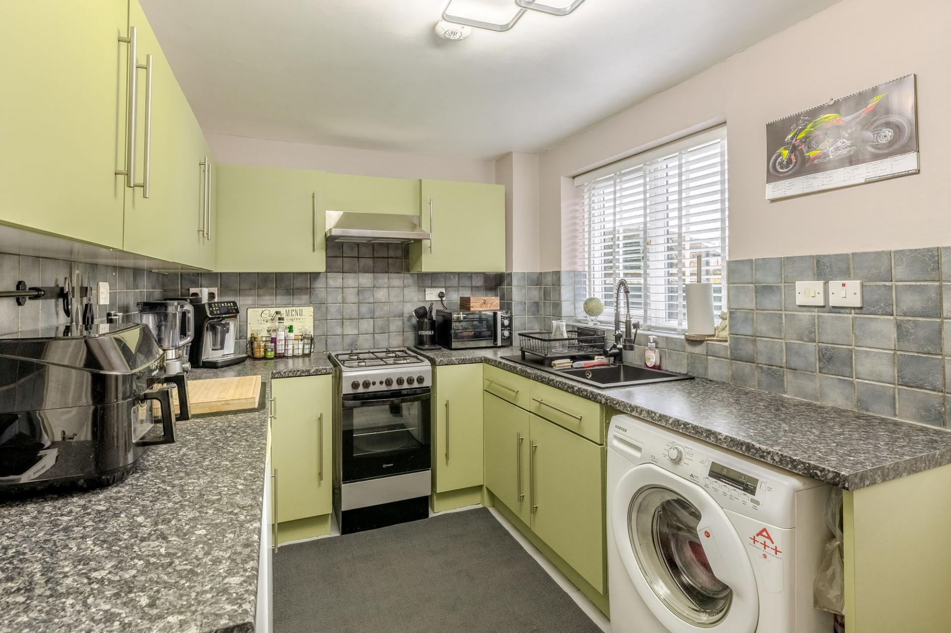 Modern two-bedroom end-terrace with bright interiors, stylish kitchen, walk-in shower, private garden, garage, and parking. Available from 9th March 2026. EPC C. Council Tax Band C.